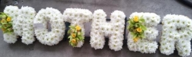 White chrysanthemum based letters with flower sprays on the M, T & E.